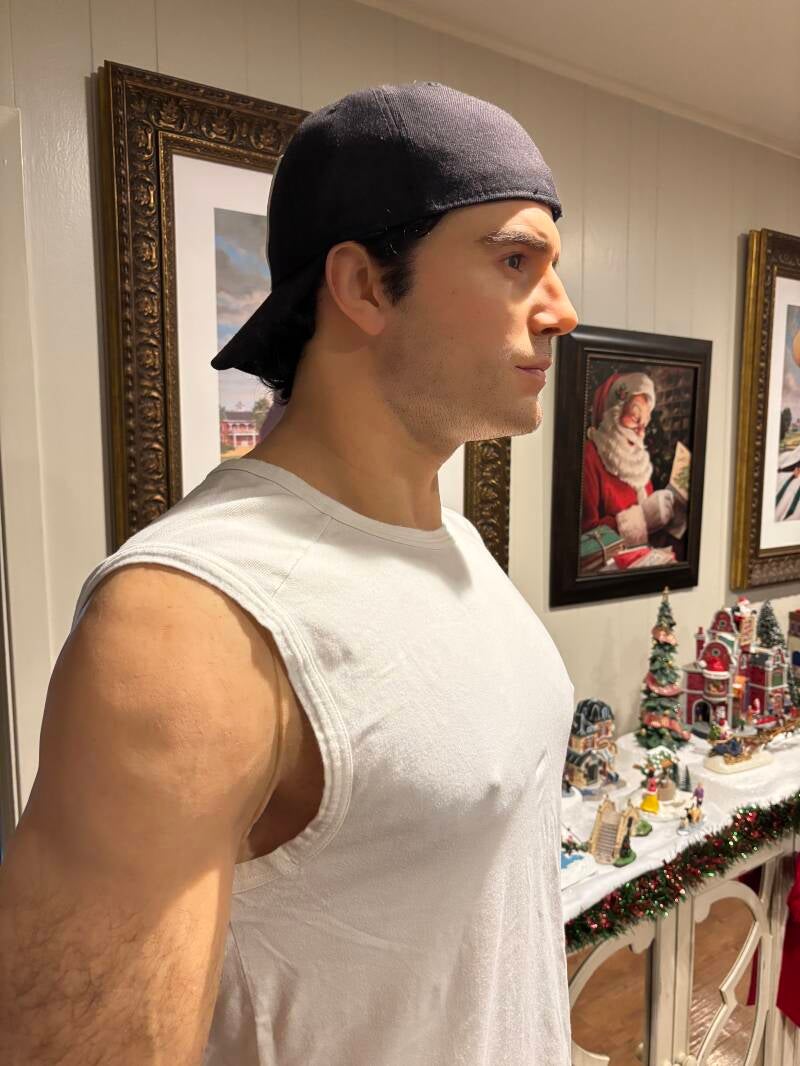 I've had several people asking me lately about Henry's pose ability thinking that he is actually able to move... I try to be transparent with the fact that he is a mannequin and basically a huge Ken doll in the way he's made (see: Gallery > "Anatomy of a Figure), and I post everywhere that I use AI.... I guess folks don't read anymore?? I made this website to specifically explain HOW he was made but people still aren't getting it. I can understand language barriers, especially if my written text isn't able to be translated but pictures also explain. There are several pages here for a reason: I want to be thorough and explore the beauty in the work of art he is, but also explore what it would be like if this amazing "uncanny valley" kind of creation WERE to move and live. But AI is used any time he smiles, holds something, sits or turns his head. In reality he only moved in 3 places: at each shoulder and at the waist. NO, he can't walk. NO, he can't sit. I think folks are confused because despite the rumors that he is a "sex doll" (those are made to bend like a human), my pictures of him clearly show he is not. Sorry to disappoint. Does he has something to help fill out his underwear? Yes. Is it attached to him as a part of his creation? No. As shown in his creation pics, he has a molded fiberglass lump. It is an insult to the artist to assume this beautiful work of art is anything other than that. And I'm not the kind of person who would publicly have a website for a sex doll. Fantasies aside folks, he's much more innocent than you'd like to believe.