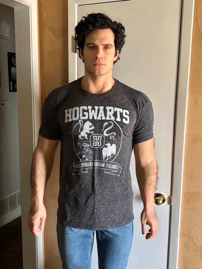 The weather in Texas changed dramatically recently and it feels like Spring already with temps getting up into the mid 70's so I thought Henry needed a tee instead of a sweater. This one is thin and clings to his muscles very nicely 😉 Hogwarts.... I definitely think he would be in Gryffindor. Have you heard the rumors that he will be might be playing Godric Gryffindor in the new HP series? 👀 Guess we will see.